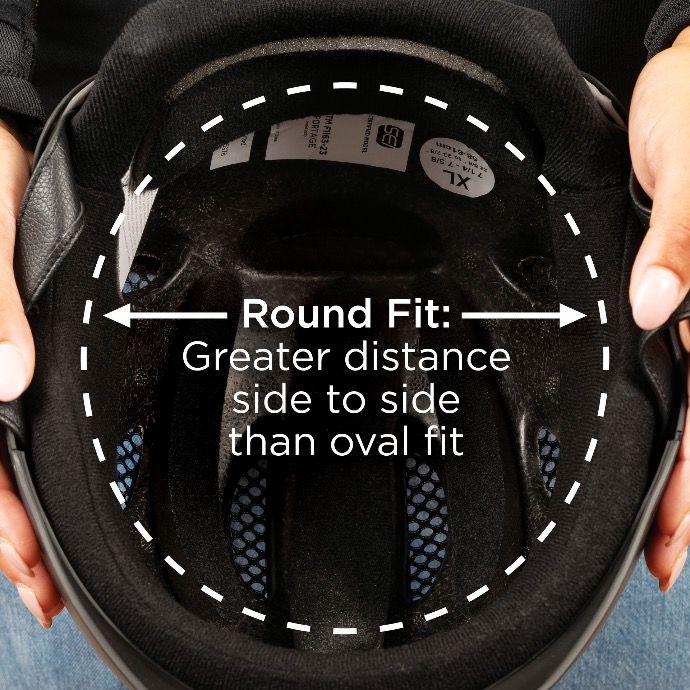 A round fit helmet will have more fit allowance on either side. You may need a round fit helmet if you find you experience gapping at the front or back of a helmet and/or pinching at the sides.